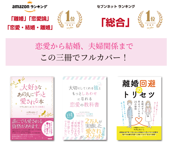 著書に「離婚回避のトリセツ〜夫婦がずっと幸せでいられる25の秘訣」(ごきげんビジネス出版)・「大切にしてくれる彼ともっとしあわせになれる恋愛の教科書」(すばる舎)・「大好きなあの人にずっと愛される本」(KADOKAWA/中経出版)がある。 |